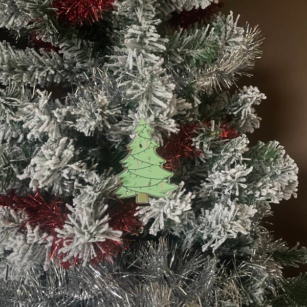 Acrylic ornament of a Christmas tree with books and bookmarks in it.