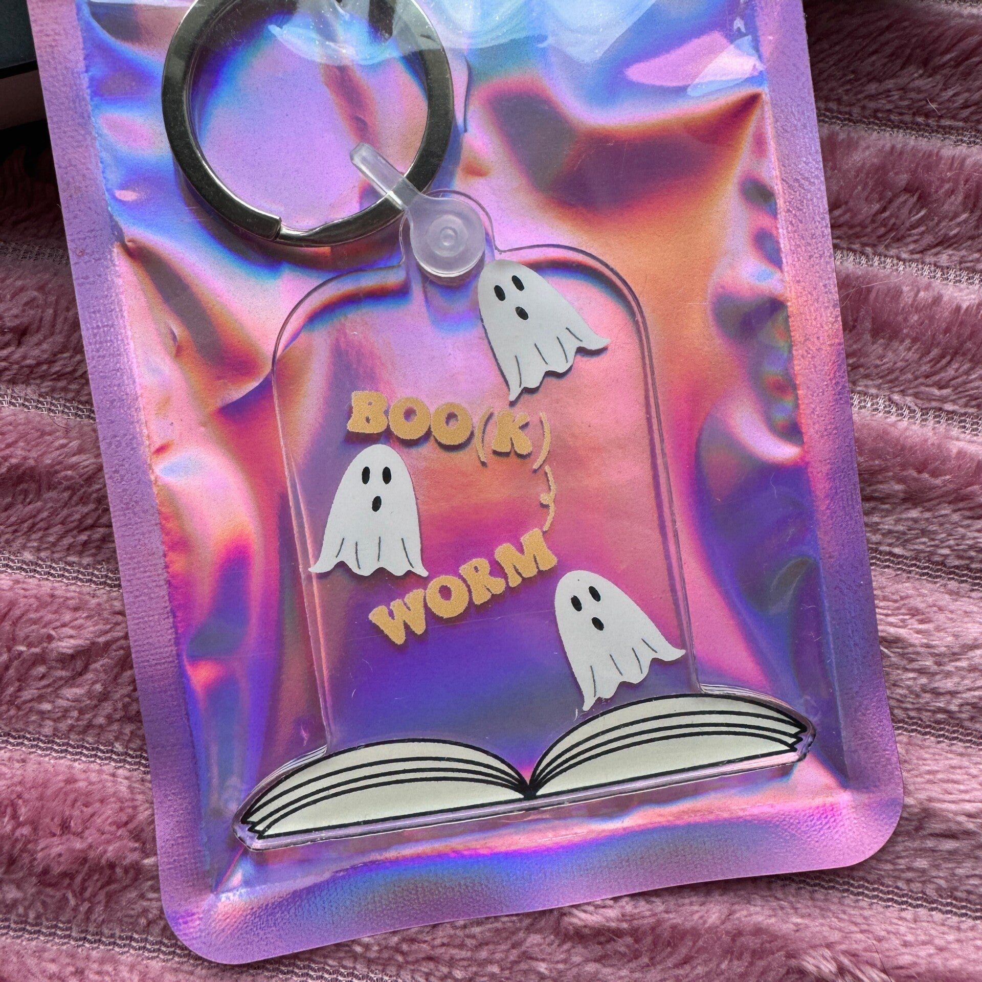 Acrylic keychain with the quote "Boo(k)worm". This keychain is perfect for your keys or as an accessory on your bag, wallet, etc.
