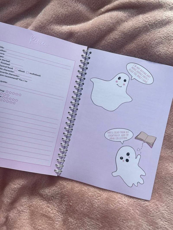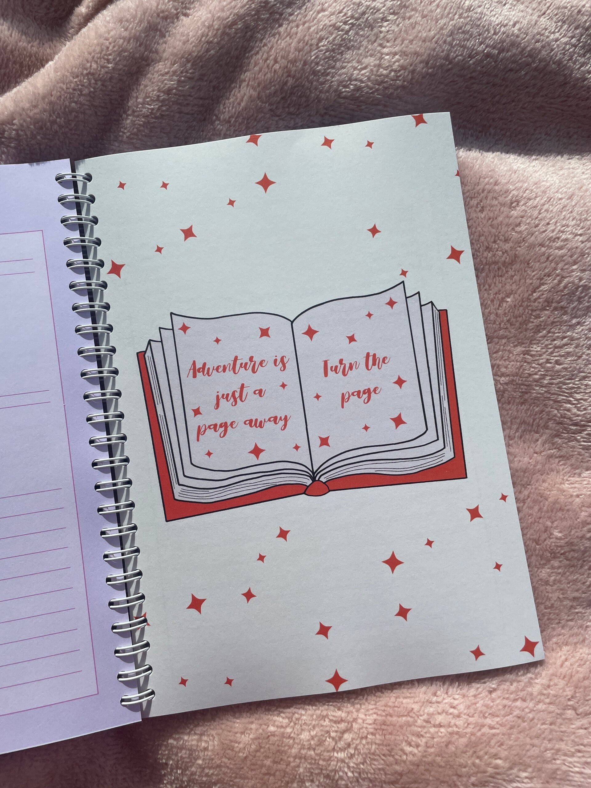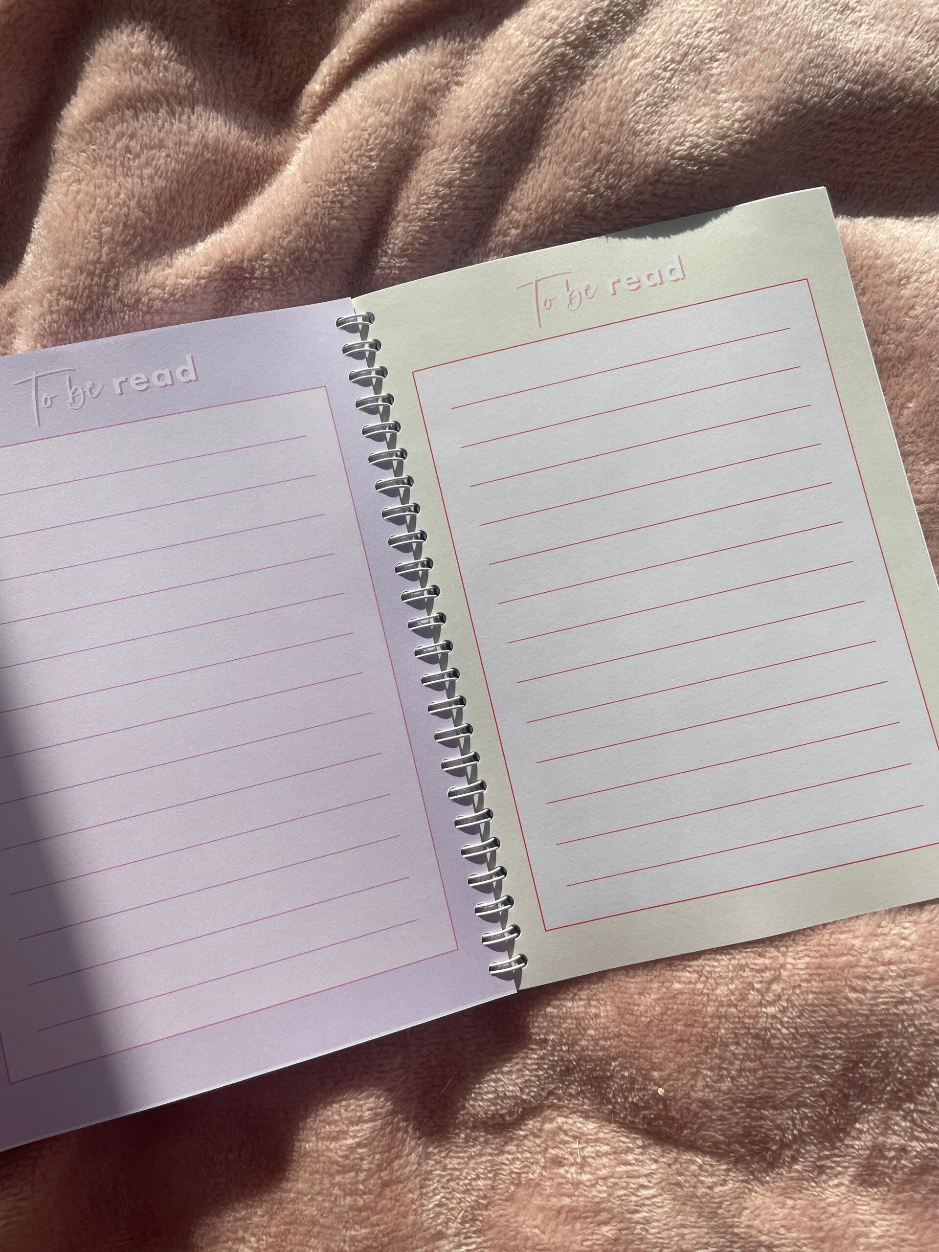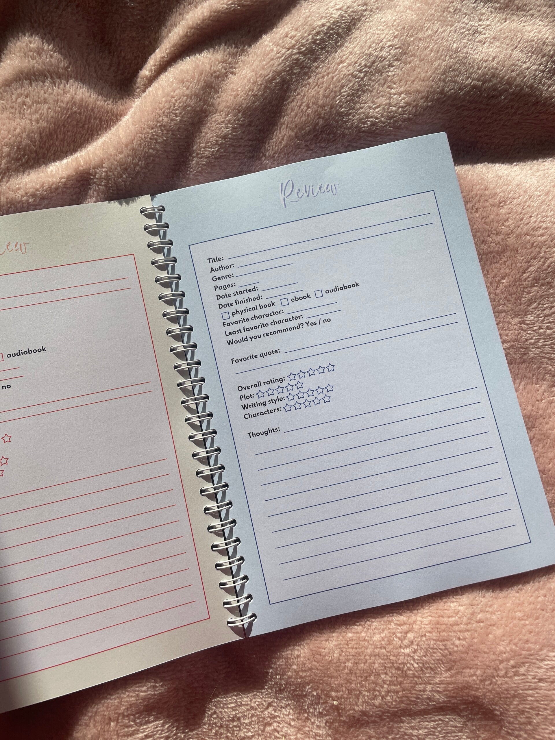 The reading journal is printed on 120gsm HVO offset paper. The cover is a 400gsm matte cover with a scratch-free matte laminate finish. This is a wire-o journal, which makes for easy flipping and a flat lay when open.